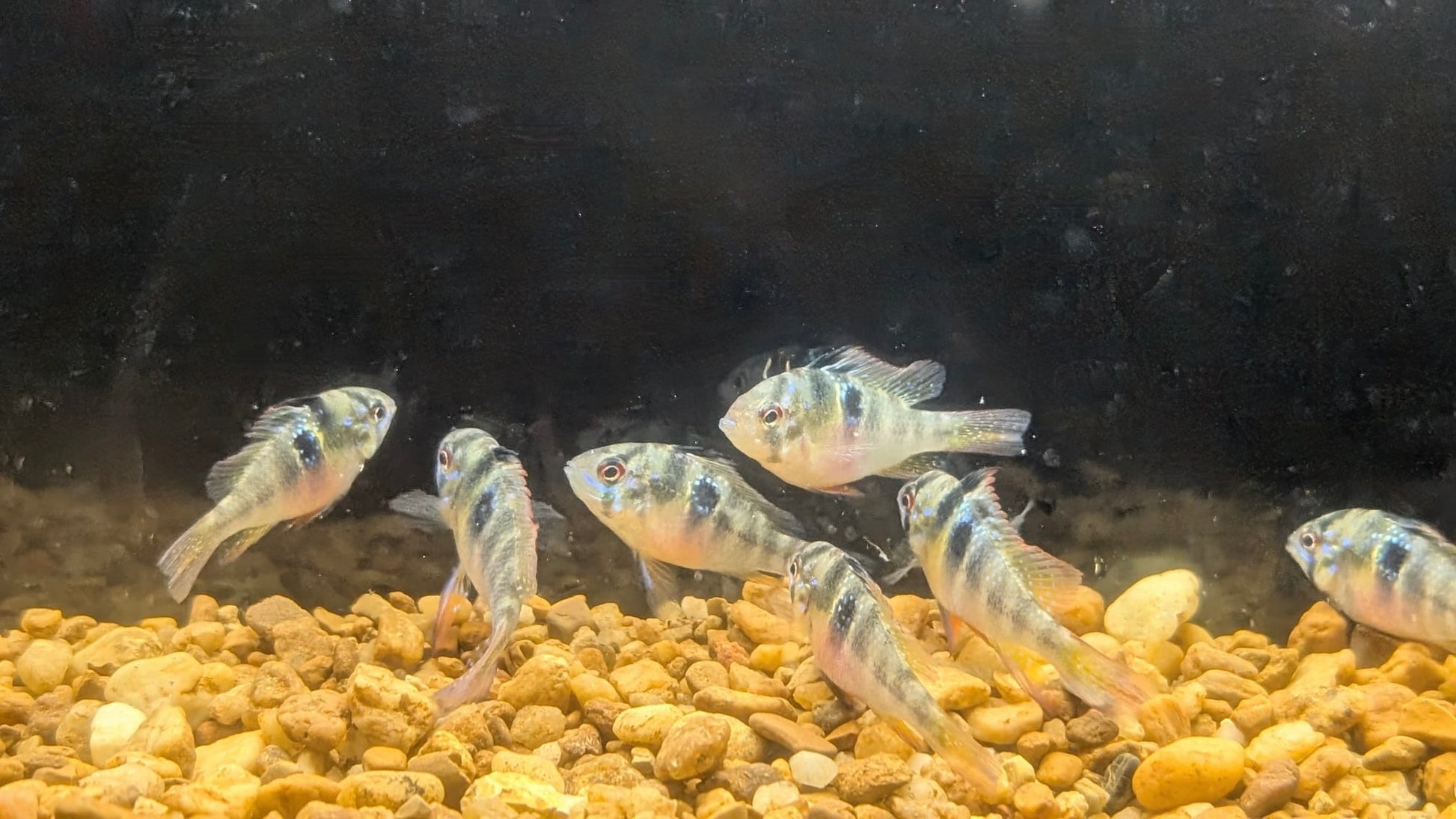 Peaceful by cichlid standards, Black Rams do well in community aquariums with calm tankmates. They are omnivores and enjoy a varied diet of high-quality flakes or pellets along with frozen or live foods such as brine shrimp, bloodworms, and daphnia.