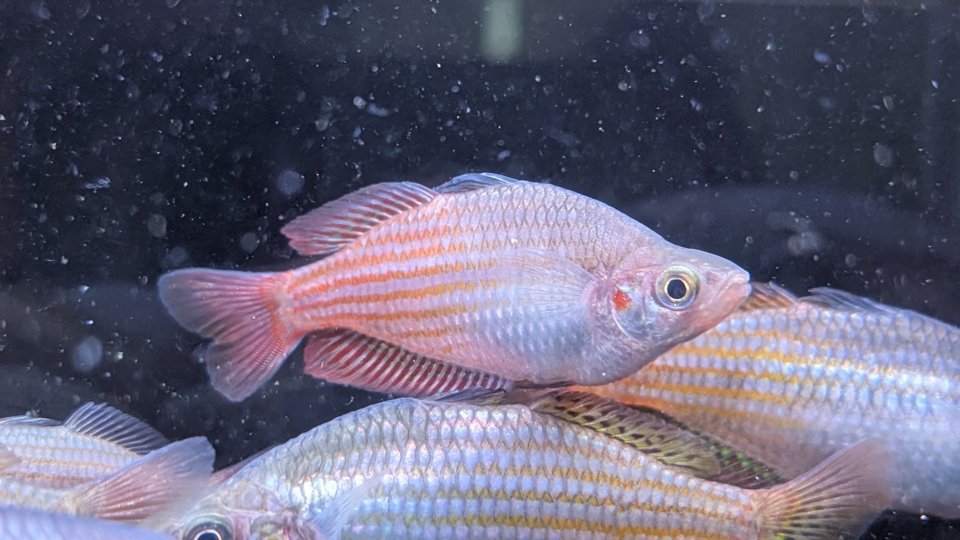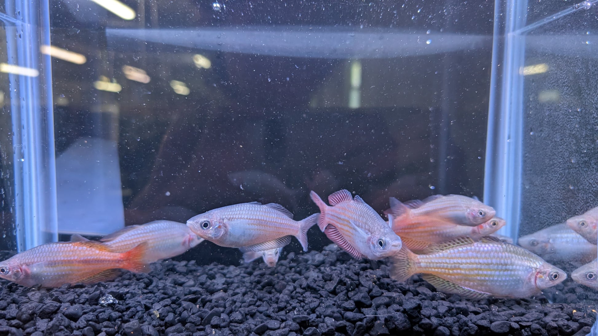 Deepwater Creek rainbowfish (Melanotaenia Splendida Splendida) are a peaceful species known for their shimmering blue-green bodies and bright orange fins. They do best in groups and show their brightest colors when kept in schools. These fish are active swimmers with a calm temperament, making them great for community tanks. They reach about 3–4 inches in length and are omnivores, happily eating high-quality flakes, pellets, and live or frozen foods like brine shrimp or daphnia. With the right care, they add vibrant movement and beauty to any planted aquarium.