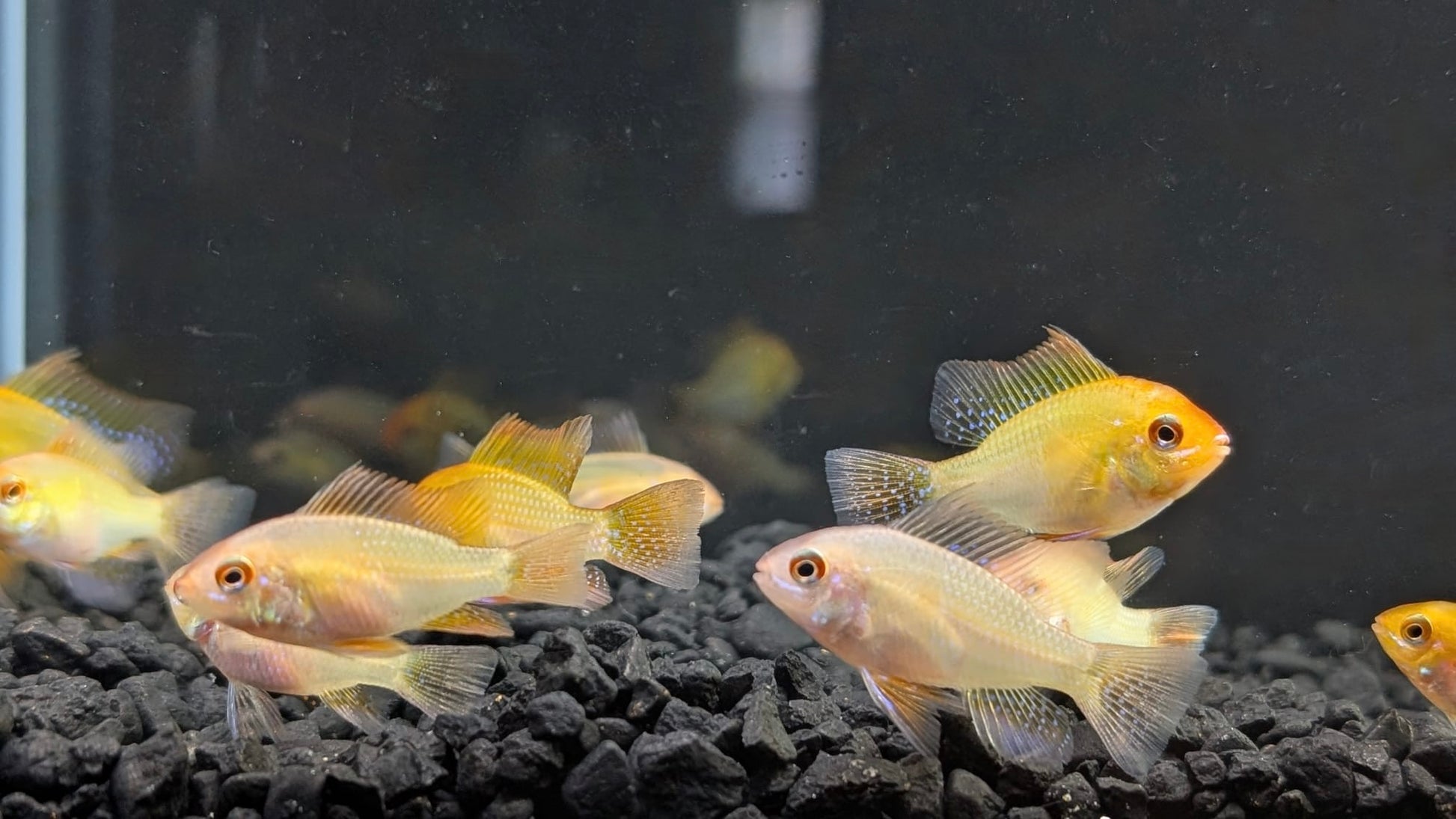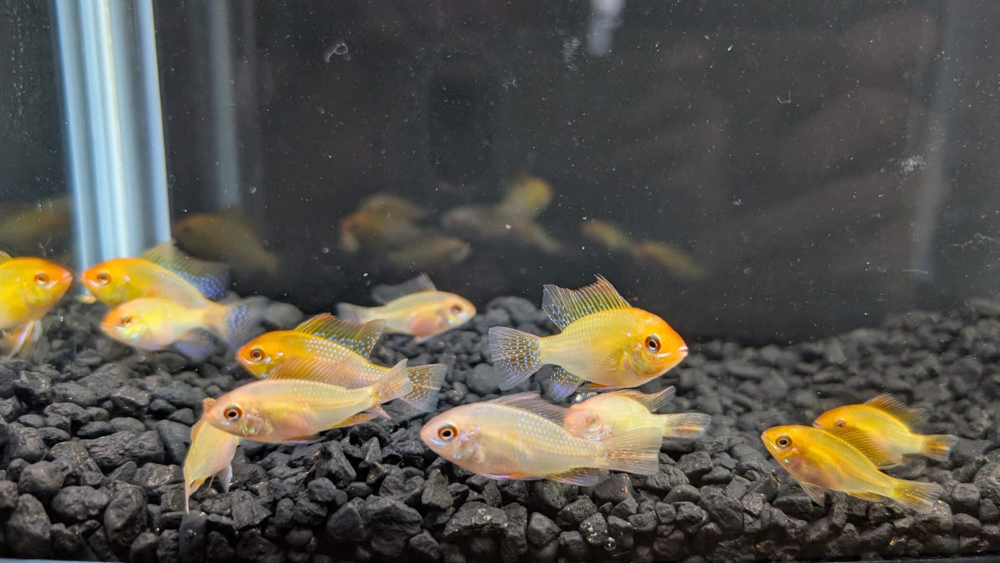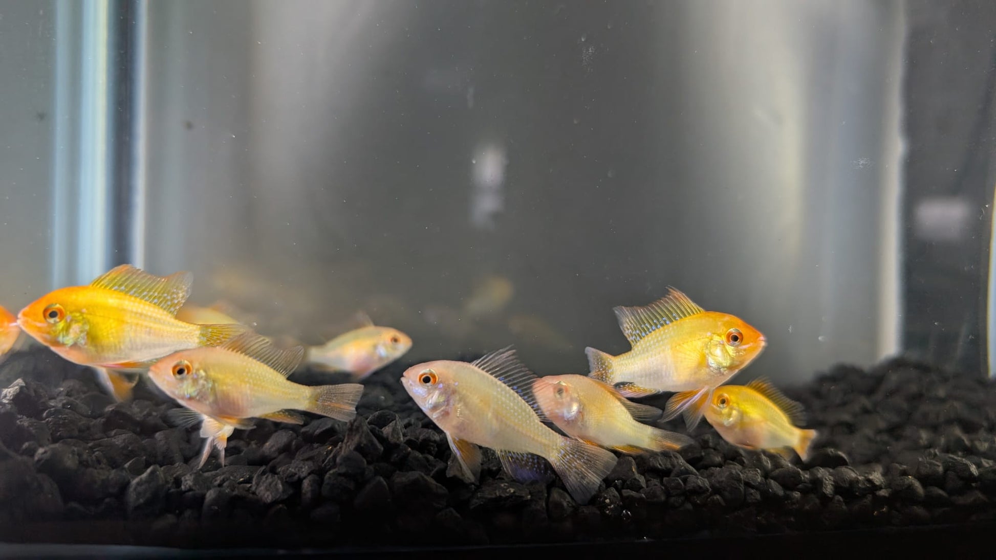 The Gold Ram (Mikrogeophagus ramirezi) is a beautiful color variant of the German Blue Ram, selectively bred for its golden-yellow body with subtle blue highlights and red accents around the fins and eyes. This dwarf cichlid stays small, usually reaching about 2–3 inches (5–7.5 cm) in length.