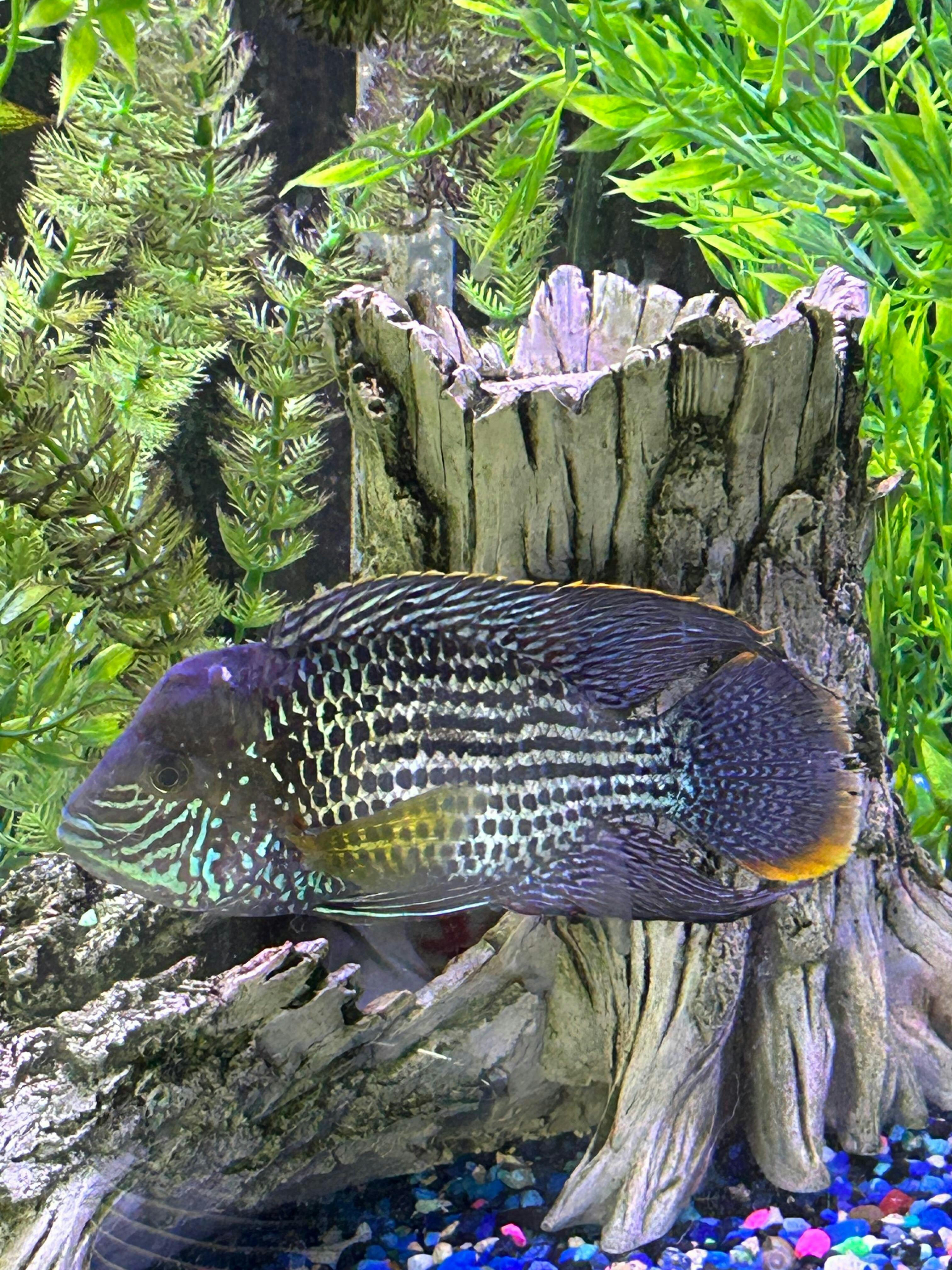 The Green Terror, Andinoacara rivulatus, is popular among hobbyists for its stunning emerald green patterned body and vibrant orange outlined dorsal and caudal fins. Male green terrors are more colorful and develop a prominent nuchal hump on their forehead.