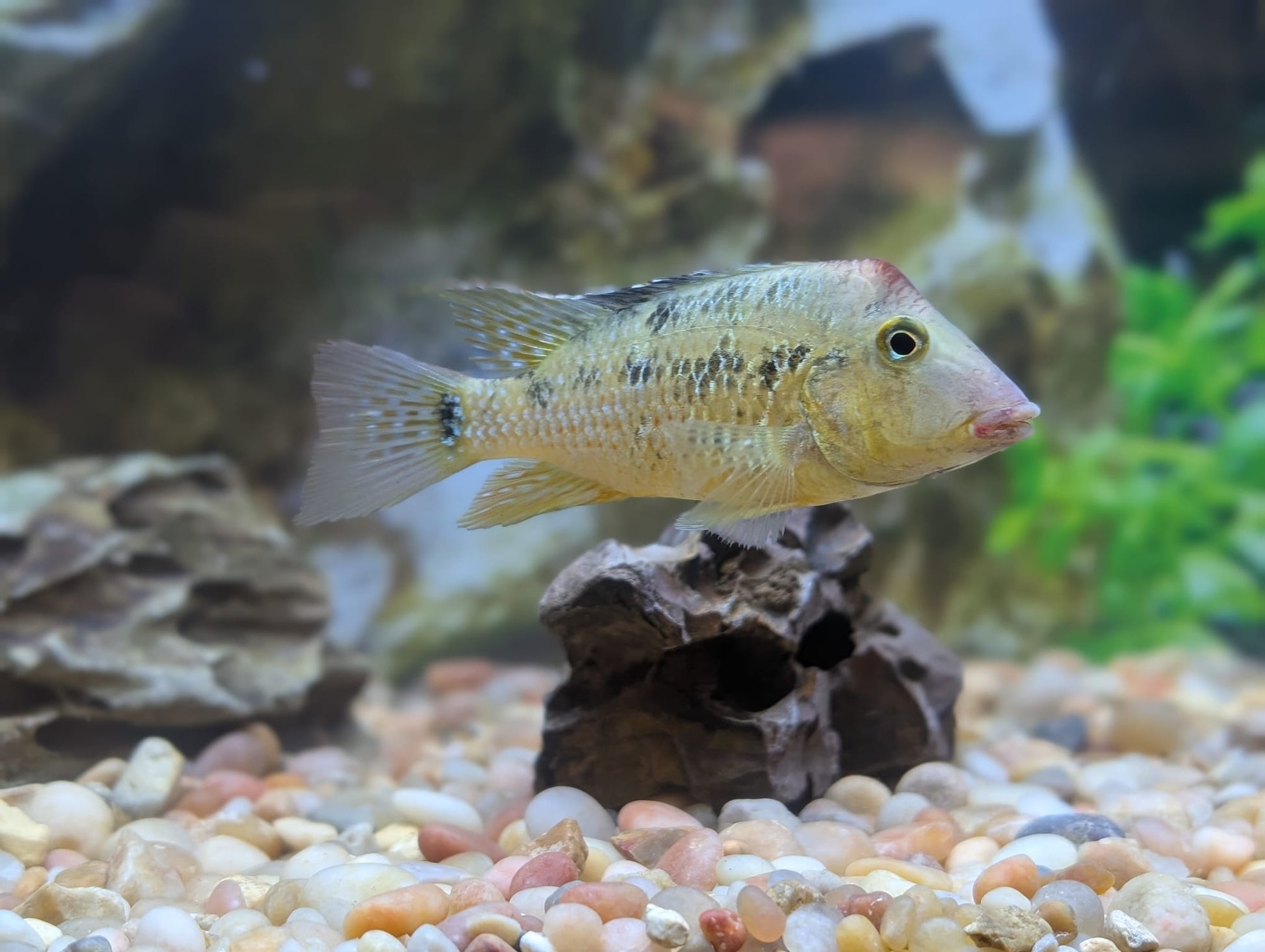 The sociable Red Hump Geos prefer living in schools of at least four, although a breeding pair also works well together. Immediate maternal mouthbreeders, the females will take the fertilized eggs into her mouth and carry them for 2-3 weeks: until the yolk sacs are absorbed and they are free-swimming. During that time she eats little to no food. Once they are free-swimming, she takes the fry into her mouth only if she senses danger.