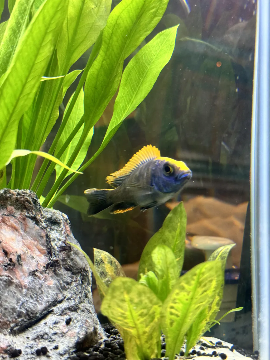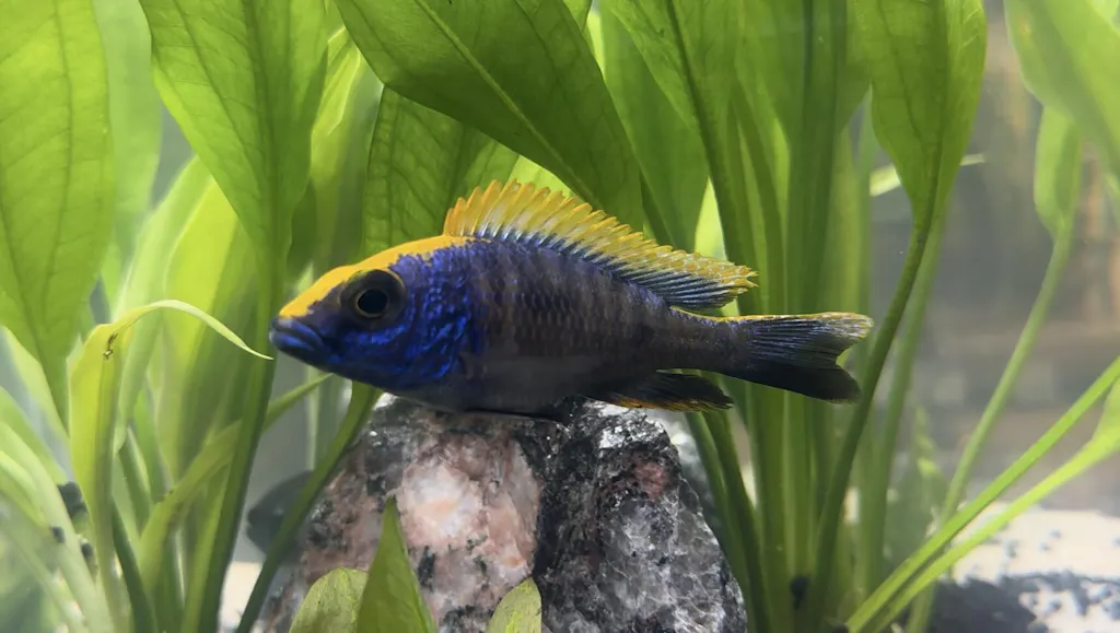 The Yellow Blaze (Otopharynx lithobates) is a beautifully colored cichlid which originates from Lake Victoria in Africa. These fish are, however, captive bred (by my dad) and have been hybridized to produce a darker blue body creating a very nice contrast to the bright yellow blaze running over the head all the way down to the tail.